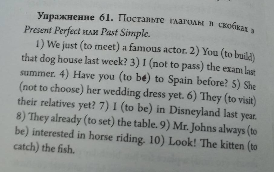 1. We've just met a famous actor. 2. Did you build that dog house last week? 3. I didn't pass the exam last summer. 4. Have you been to Spain before? 5. She hasn't chosen her wedding dress yet. 6. Have they visited their relatives yet? 7. I was in Disneyland last year. 8. They've already set the table. 9. Mr. Jones was always interested in horse riding. 10. Look! The kitten has caught the fish.