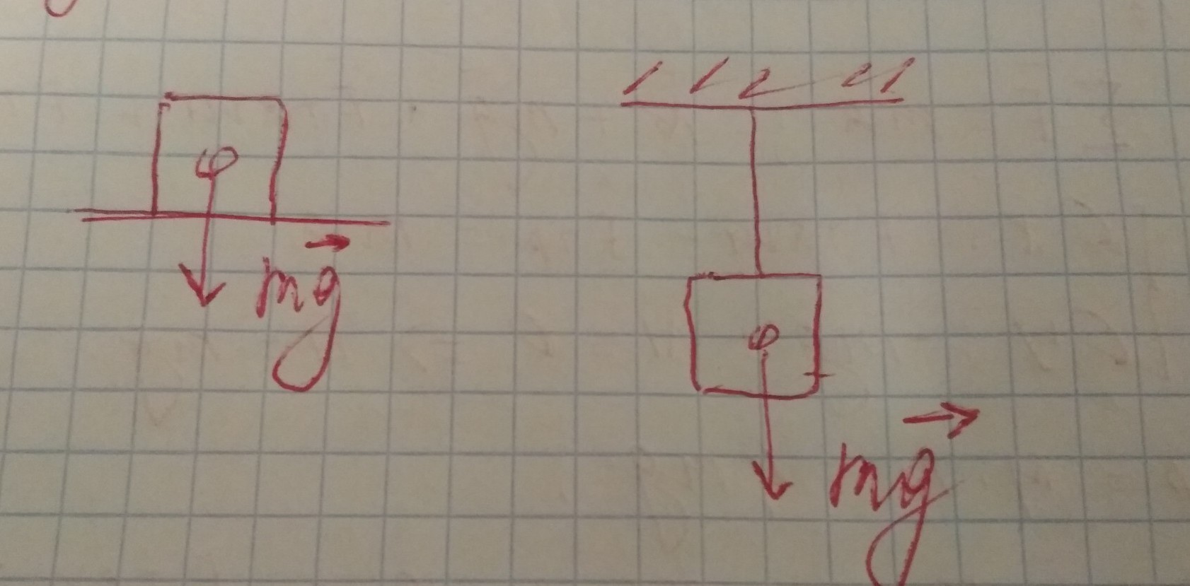 в обоих случаях сила тяжести приложена к центру кубика и направлена вертикально вниз .