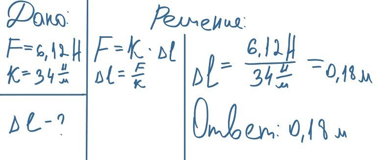 Определи на сколько сантиметров удлинится пружина под действием силы 6,12 Н. Коэффициент жесткости пружины равен 34 Н/м