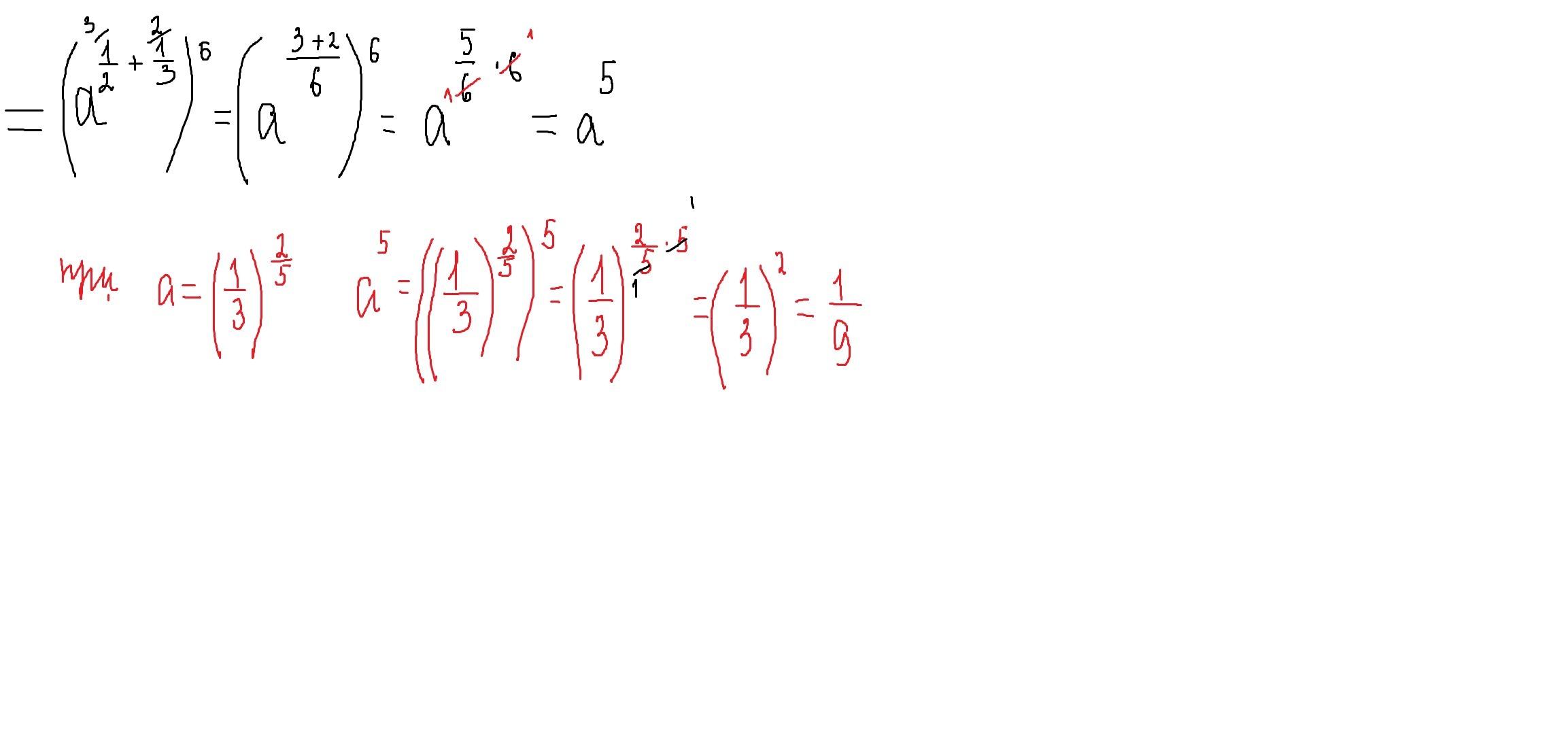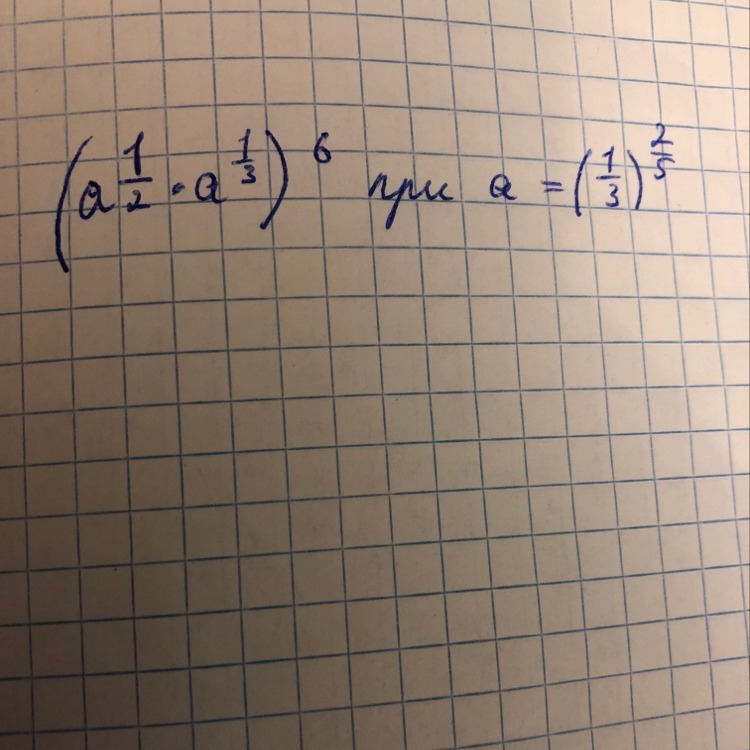 (a¹⁾²· a¹⁾³)⁶ = a¹⁾²*⁶· a¹⁾³*⁶ = a³·a² = a³⁺² = a⁵ (при умножении степени складываются)