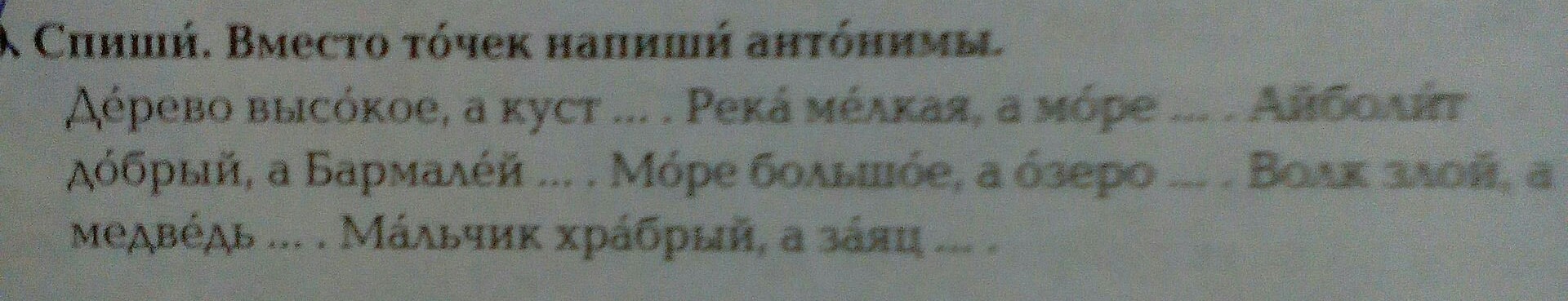 Дерево высокое, а куст низкий. Река мелкая, а море глубокое. Айболит добрый, а Бармалей злой. Море большое, а озеро маленькое. Волк злой, а медведь добрый. Малчик храбрый, а заяц трусливый.