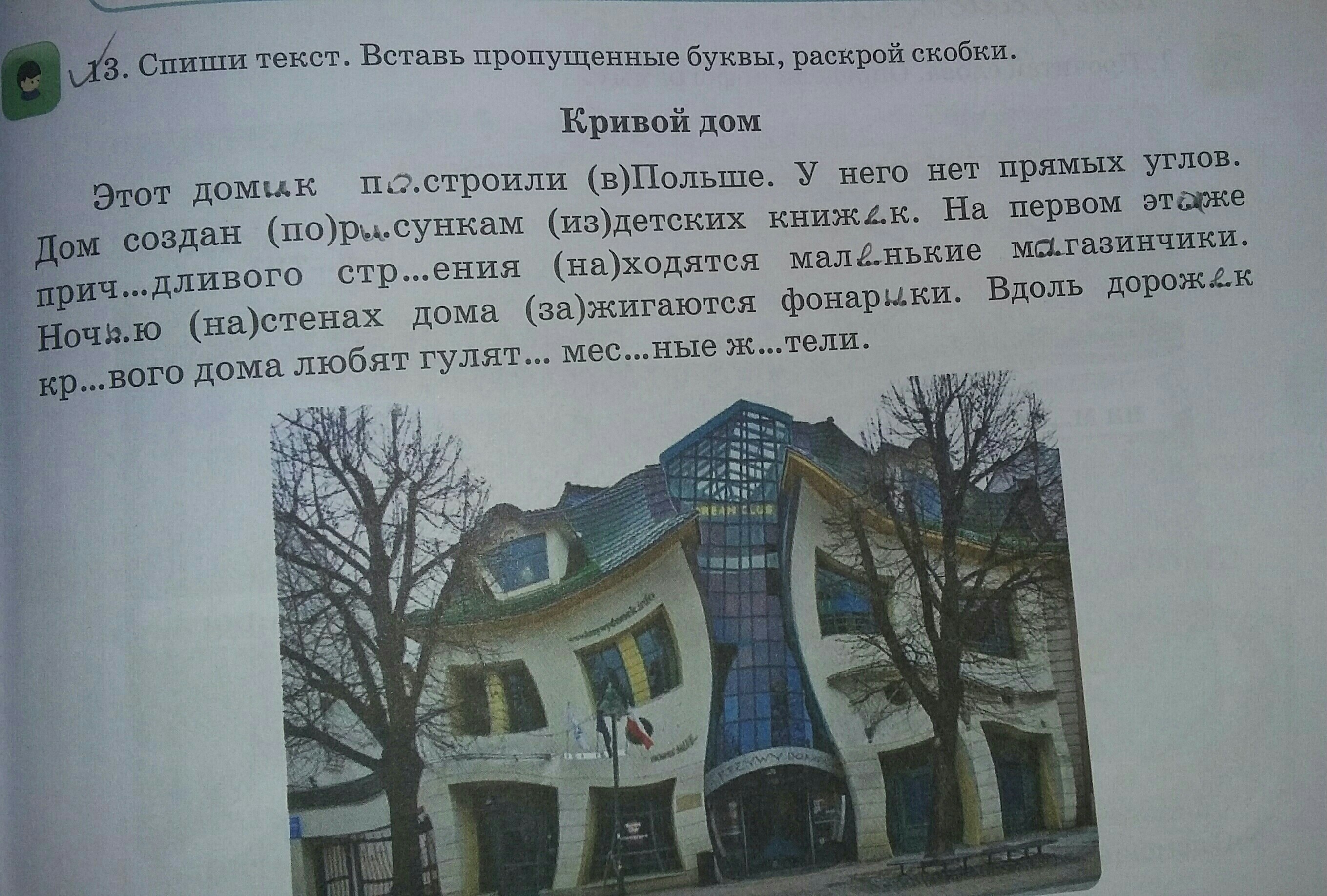 Этот домик построили в Польше. У него нет прямых углов. Дом создан по рисункам из детских книжек. На первом этаже причудливого строения находятся маленькие магазинчики. Ночью на стенах дома зажигаются фонарики. Вдоль дорожек кривого дома любят гулять местные жители.