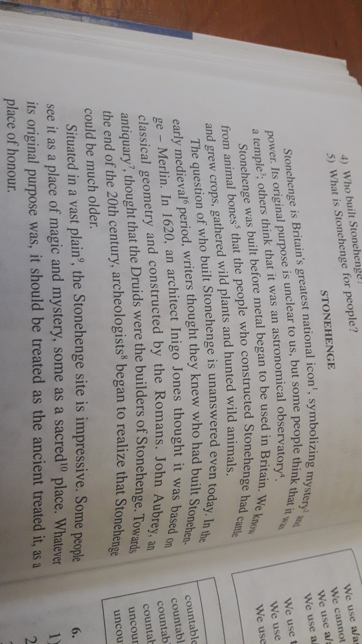 СТОУНХЕНДЖ Стоунхендж - величайшая национальная икона Британии », символизирующая для нас, но некоторые люди думают, что это сила. Его первоначальная цель - неясен храм, другие думают, что это была астрономическая обсерватория. Стоунхендж был построен до того, как металл начал использоваться из костей животных, которые люди, которые строили Стоун и выращивали зерновые культуры, собирали дикие растения и охотились в дикой природе. Вопрос о том, кто построил Стоунхендж остается без ответа даже в период раннесредневекового периода, писатели думали, что они знали, кто строил Мерлин. В 1620 году архитектор Иниго Джонс подумал, что это классическая геометрия, построенная римлянами. Иоанн Обрский Антиквариат », считая, что друиды были строителями Стоунхена в конце 20-го века, археологи начали понимать, что Св. Мог быть намного старше. Тон Onehenge Расположенный в обширной равнине, сайт Стоунхендж впечатляет. Некоторые люди считают это место волшебством и тайной, другие - священным местом. Каким бы ни было его первоначальное назначение, к нему следует относиться так же, как к нему относились древние, как к честному человеку
