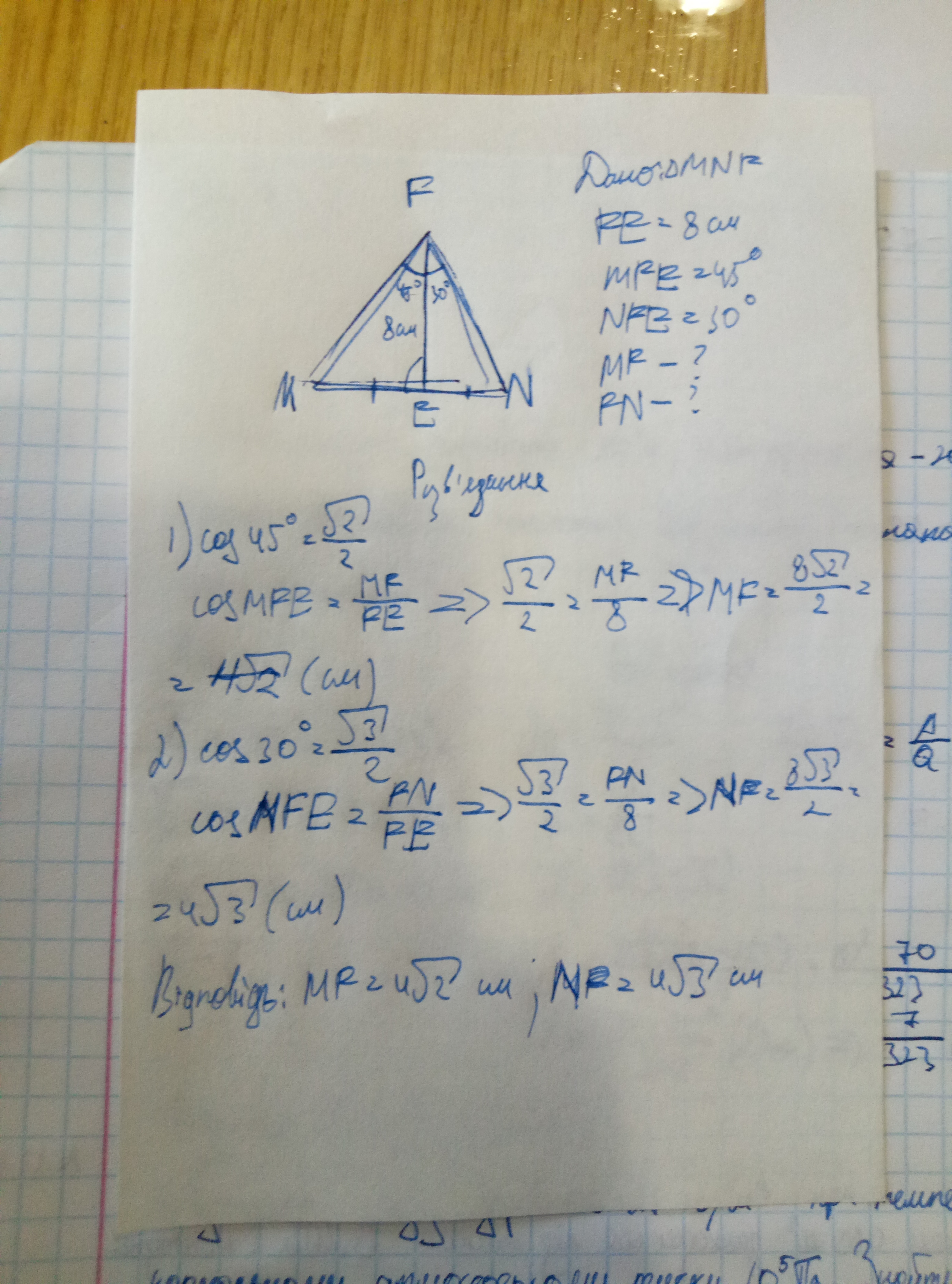 В треугольнике MFN FE-медиана. FE=8, уголMFE=45, уголNFE=30. Найти MF и FN ( с помощью теоремы синусов )