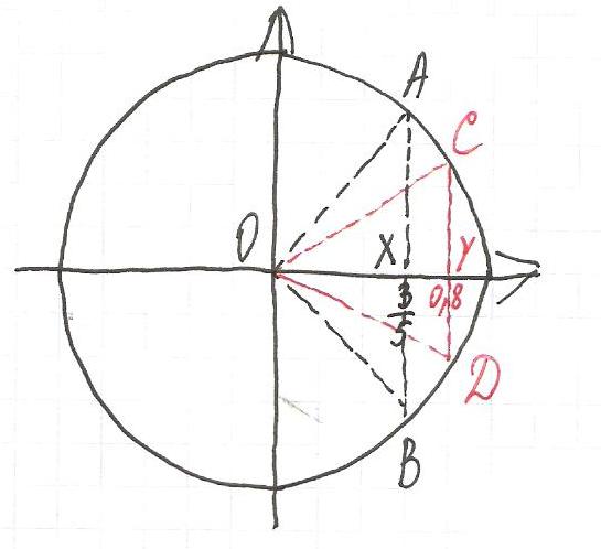 Надеюсь будет понятно. С косинусом 3/5 - черные треугольники ОАХ и ОВХ, с косинусом 0,8 - красные треугольники ОСУ и ОDY..