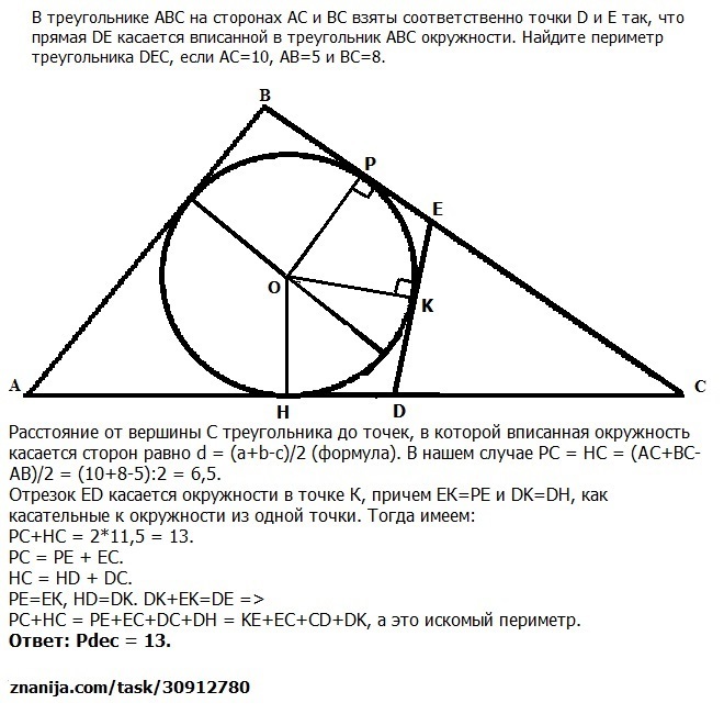В треугольнике ABC на сторонах AС и BC взяты соответственно точки D и E так, что прямая DE касается вписанной в треугольник ABC окружности. Найти периметр треугольника DEC, если AC = 10, AB = 5, BC = 8.