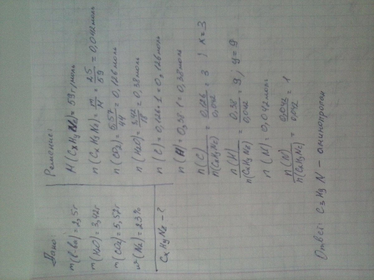 При сжигании 2.5 г вещества образовалось 3.42г H2O и 5.57 CO2. В состав вещества, кроме водорода и углерода входит азот (23%). Какова молекулярная формула.