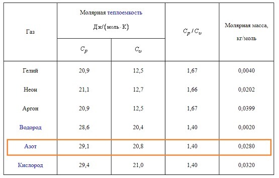 γ = Сp / Cv = 29,1 / 20,8 ≈ 1,40