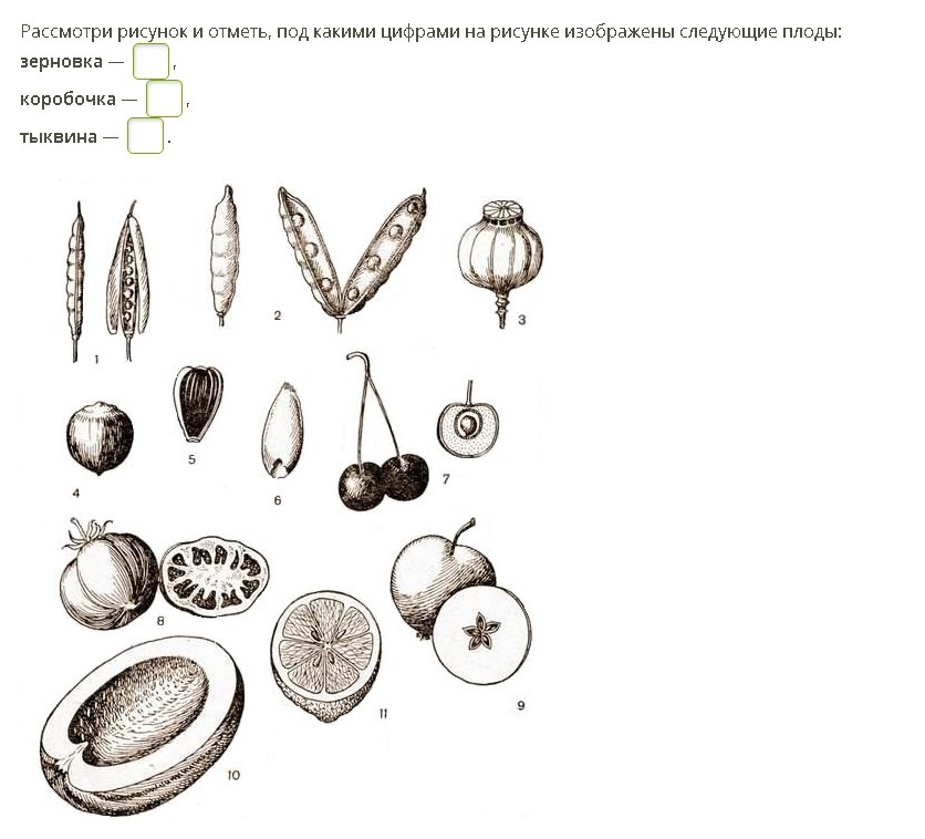 Рассмотри рисунок и отметь, под какими цифрами на рисунке изображены следующие плоды: