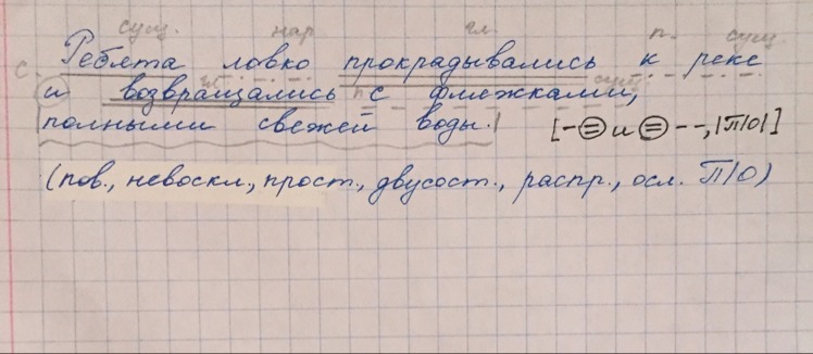 повествовательное, невосклицательное, простое, 2-х составное, распространенное, осложненно однородными сказуемыми и причастным оборотом
