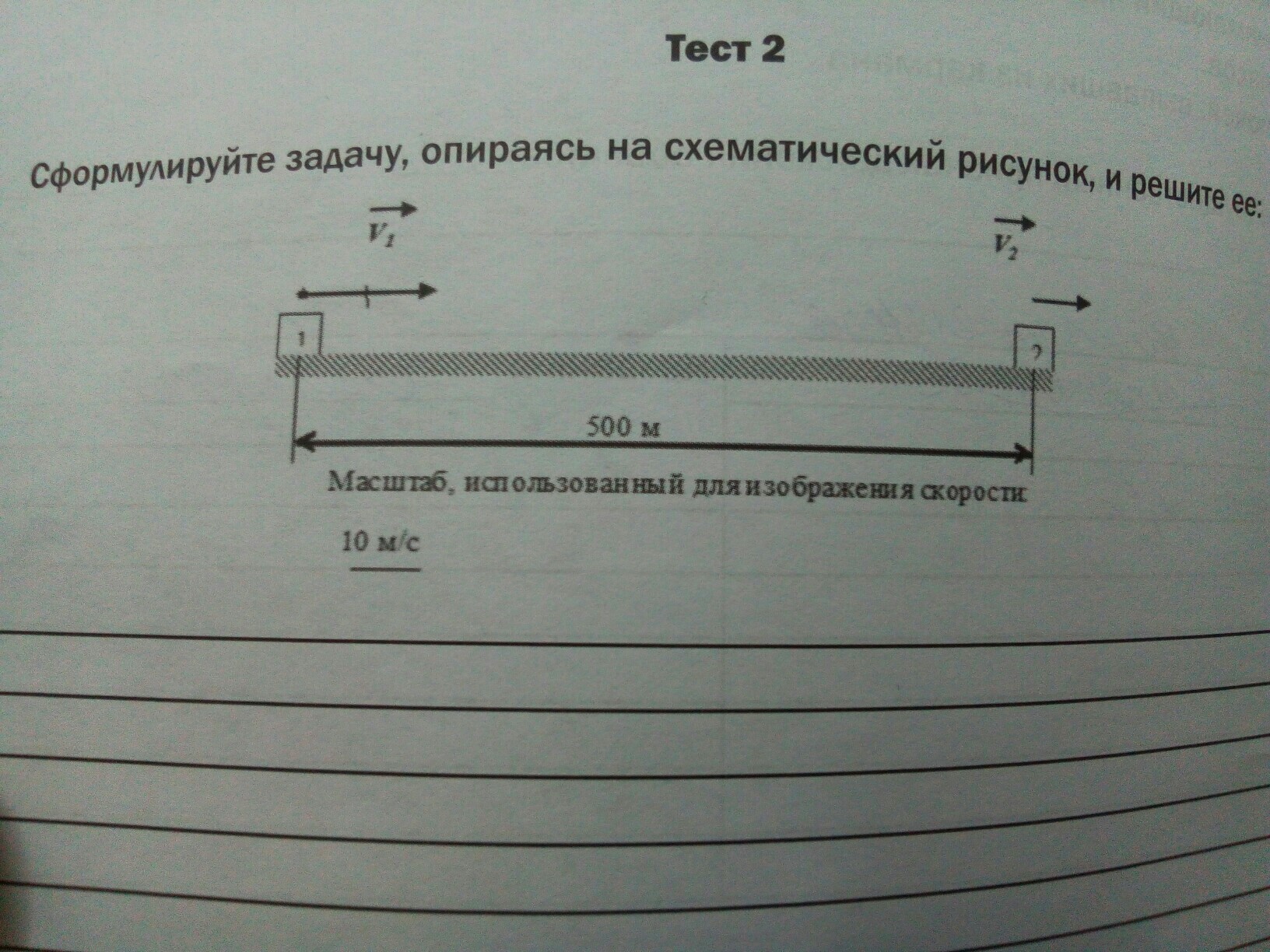 Первое тело двигалось со скоростью 20 м/с, второе тело находясь на расстоянии 500 м от первого двигалось со скоростью в 2 раза меньшей. Найти время, через которое первое тело догонит второе и координату этого места.