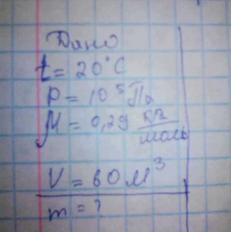 T=293 K p=10^5 Па M=0.29 кг/моль V=60 м3 m=?