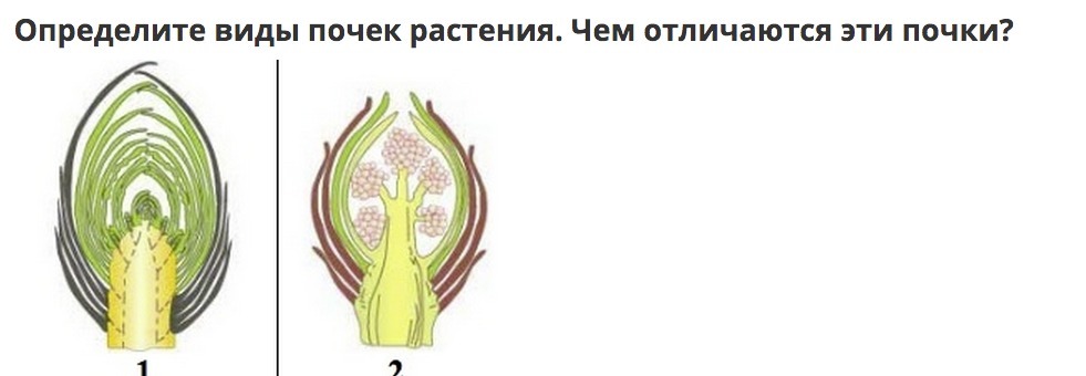 1 почка вегетативная, потому что в ней видны зачатки листьев и разовьется она либо в лист, либо в побег