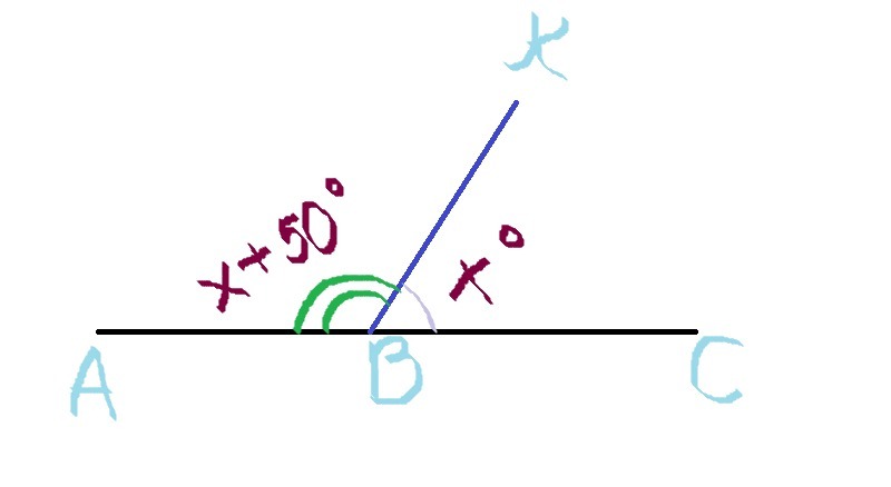 Пусть х° - угол КВС, тогда х+50° - угол АВК. угол АВК + угол СВК = 180°, т.к. эти углы смежные. Составим уравнение: