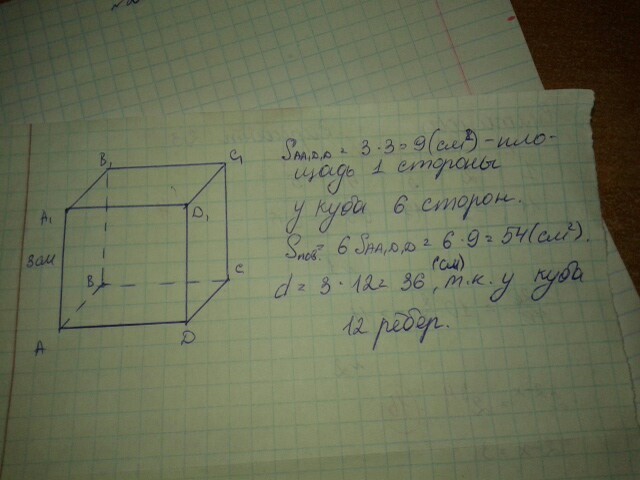 Начертите в тетради куб со стороной 3см. Найдите площадь егНачертите в тетради куб со стороной 3см. Найдите площадь его поверхности и длину всех рёберо поверхности и длину всех рёбер