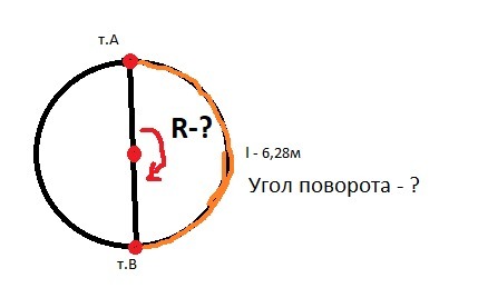 При движении не по окружности точка переместилась из Т. А в Т. В за время t=2 секунды пройдя путь l = 6.28 метров. Найти угол поворота и радиус окружности