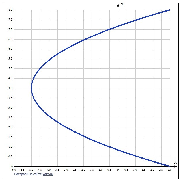 Ветви параболы направлены вправо, вершина расположена в точке (x0, y0), т.е. в точке (-5;4)