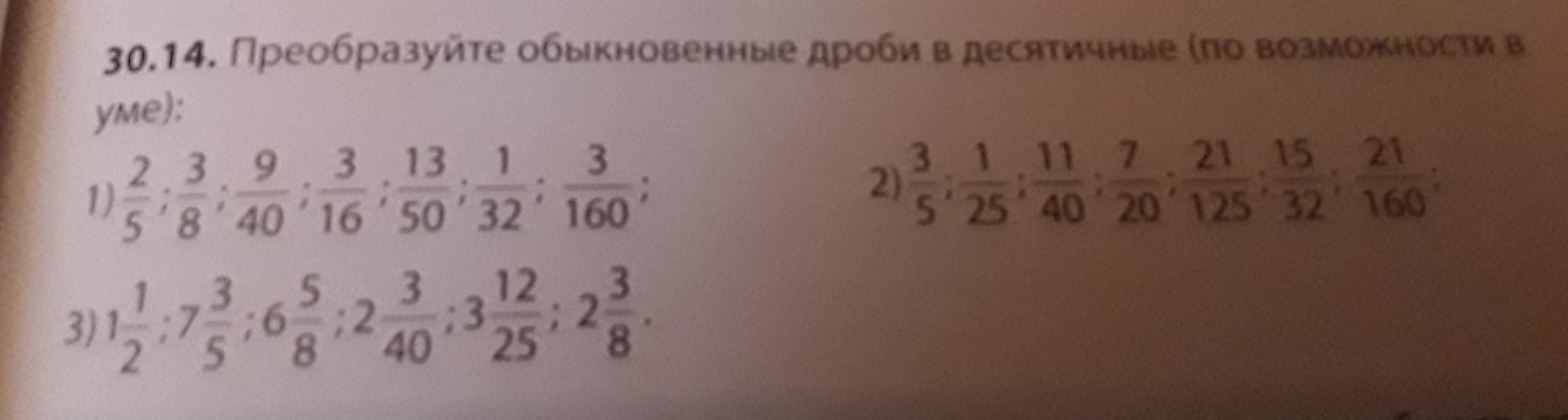2) 3/5=0,6; 1/25=0,04; 11/40=0,275; 7/20=0,35; 21/125=0,168; 15/32=0,46875; 21/160=0,13125;