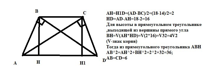 Найдите боковую сторону равносторонней трапеции, основания которой равны 14 см и 18 см, а диагонали перпендикулярны к боковым сторонам.