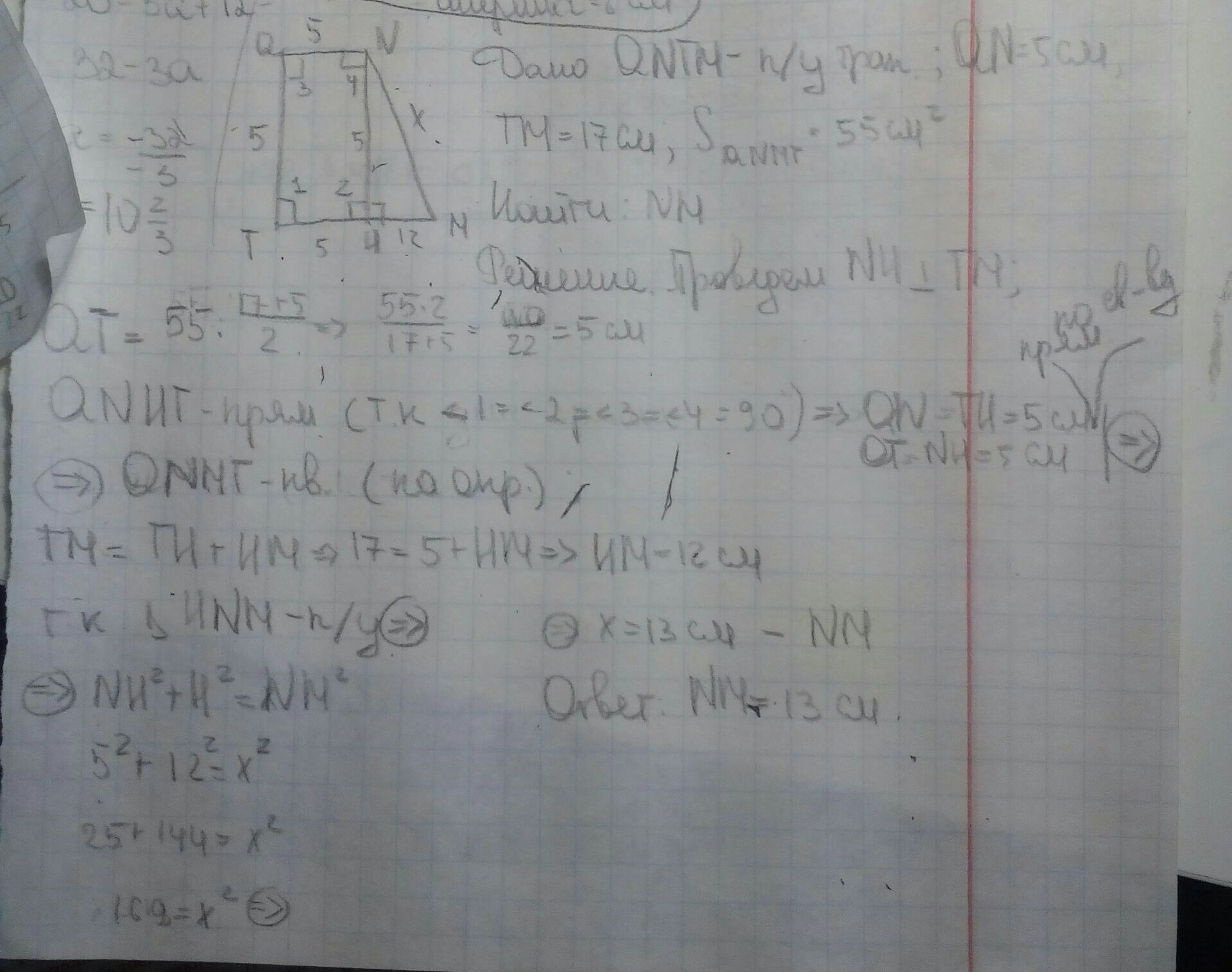 Имеем прямоугольный треугольник NKM: NK = QT = 5 (так как QNKT - прямоугольник), MK = TM - TK = 17 - 5 = 12.