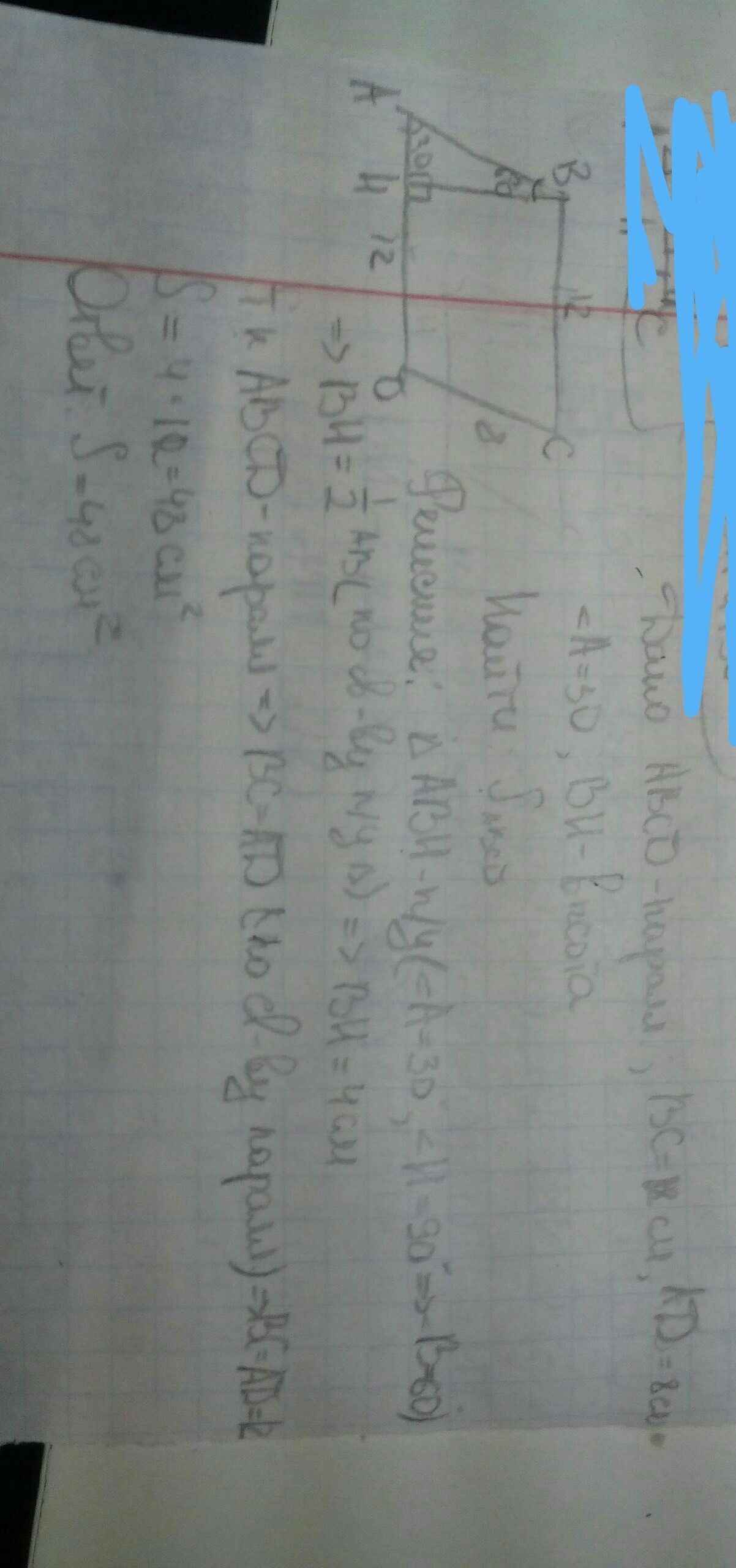 Стороны параллелограмма равны 12 см и 8 см, а угол между высота и, проведённым из вершины тупого угла 30°. Найдите площадь параллелограмма