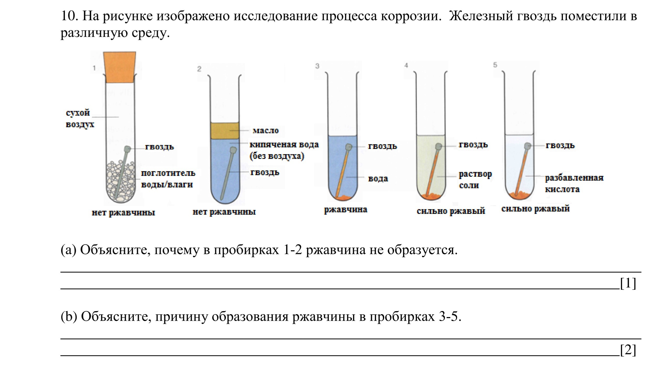 А в пробирках 3 - 5 доступ кислорода не перекрыт и во всех трех пробирках есть вода. Для протекания процесса ржавления необходимо присутствие кислорода из воздуха или еще откуда и воды.