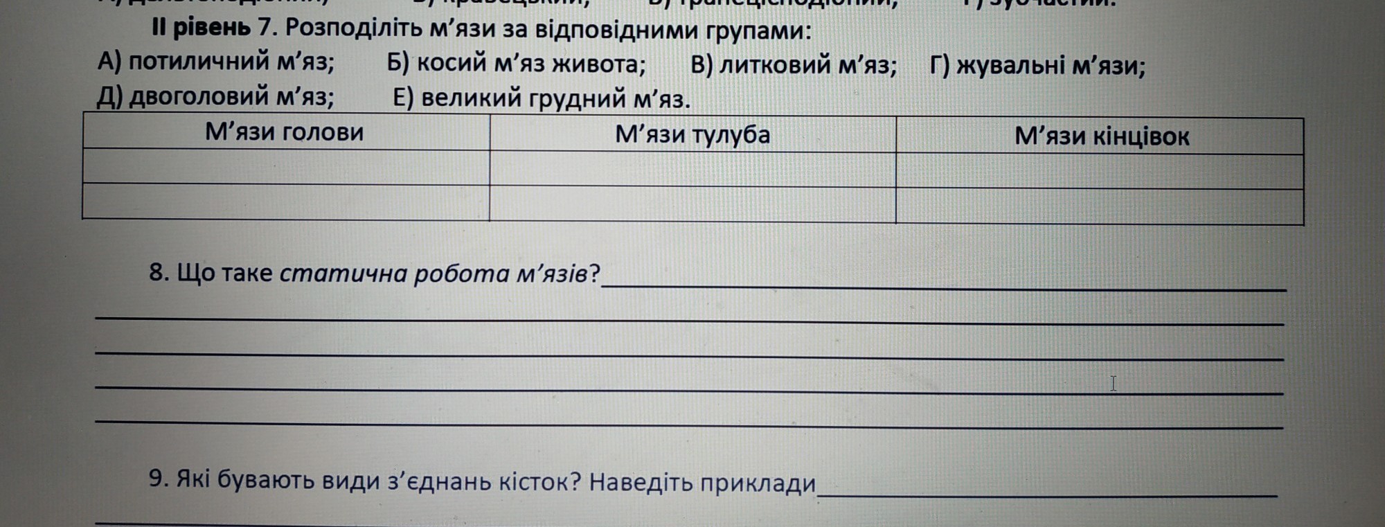 1ГА 2БЕ 3ВА 9рухомо, нерухомо, напіврухомо. 8Робота, при якій м’язи скорочуються, не змінюючи своєї довжини, а лише збільшуючи напругу (ізометрично), називається статично