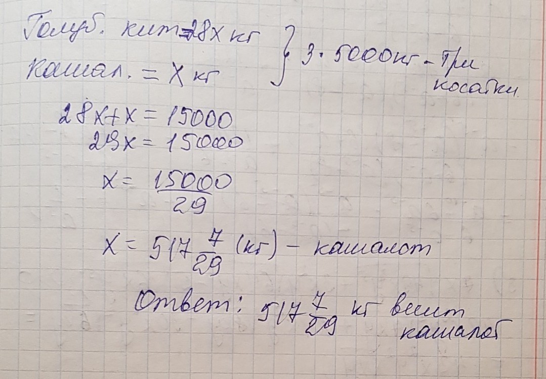 Если к весу голубого кита прибавить вес кашалота, то получится вес 3 китов косаток. Чему равен вес кашалота, если известно, что голубой кит тяжелее кита в 28 раз, а косатка весит 5000 кг?