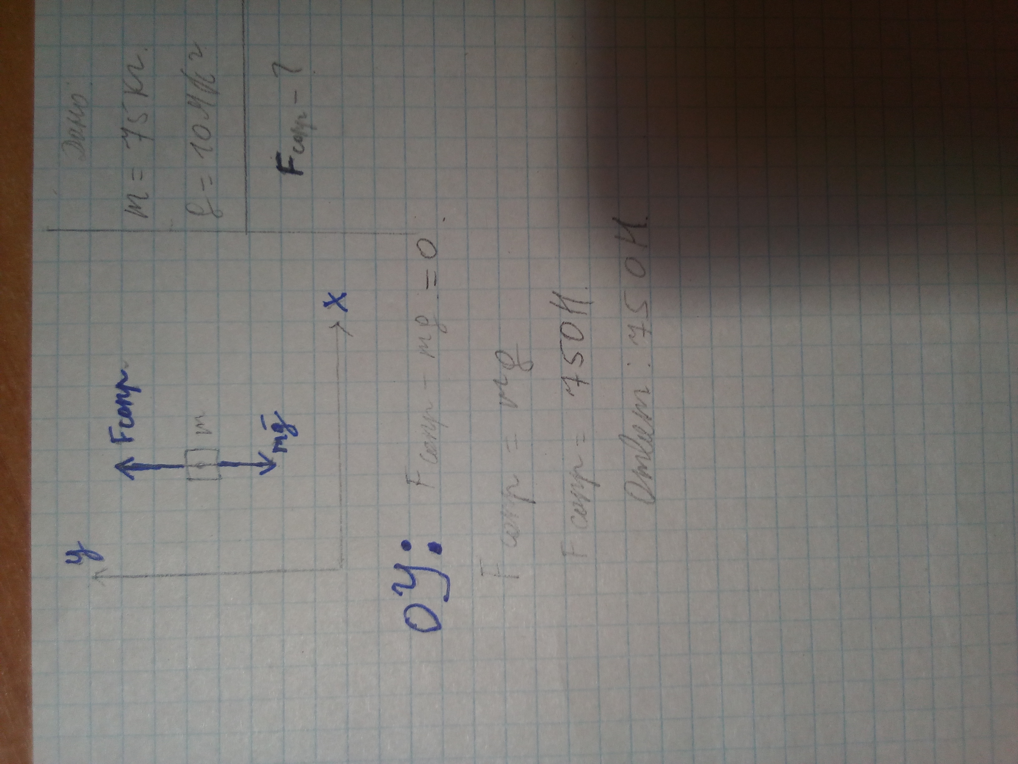 (Сложение сил вдоль прямой)Парашютист равномерно спускается на парашюте.Масса человека 75кг.Найти силу сопротивления воздуха.Выполнить чертеж.