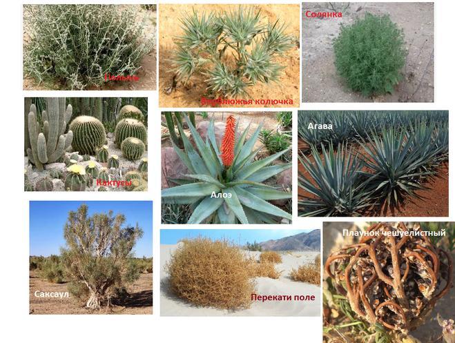 Как мы знаем в пустыне очень суровый климат для различных растений и всего живого. Из-за жаркого климата в пустыне могут существовать только те растения,которые могут обходиться без воды большое количество времени.Например, кактусы, некоторые из них способны накапливать влагу на запас,Верблюжья колючка, тоже обитает в пустыне, для выживания помогает уходящая в глубь в 20 метров корневая система (корни растения).Также в пустыне растет алоэ(вид кактуса).Есть в пустыне ещё и кустарники высотой до 1 метра: курчавка, вьюнок, солянки древовидные, ежевники. Полукустарники, у которых отмирает большая часть растения зимой: полыни и те же солянки, которых в пустыне - большое разнообразие.Для наглядности можно посмотреть картинку.