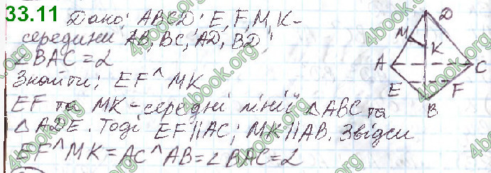 Точки E, F, M и K — середини соответственно ребер AB, AD, CD и BC тетраедра DABC. Известно, что EM = FK. Найдите угол между прямими AC и BD