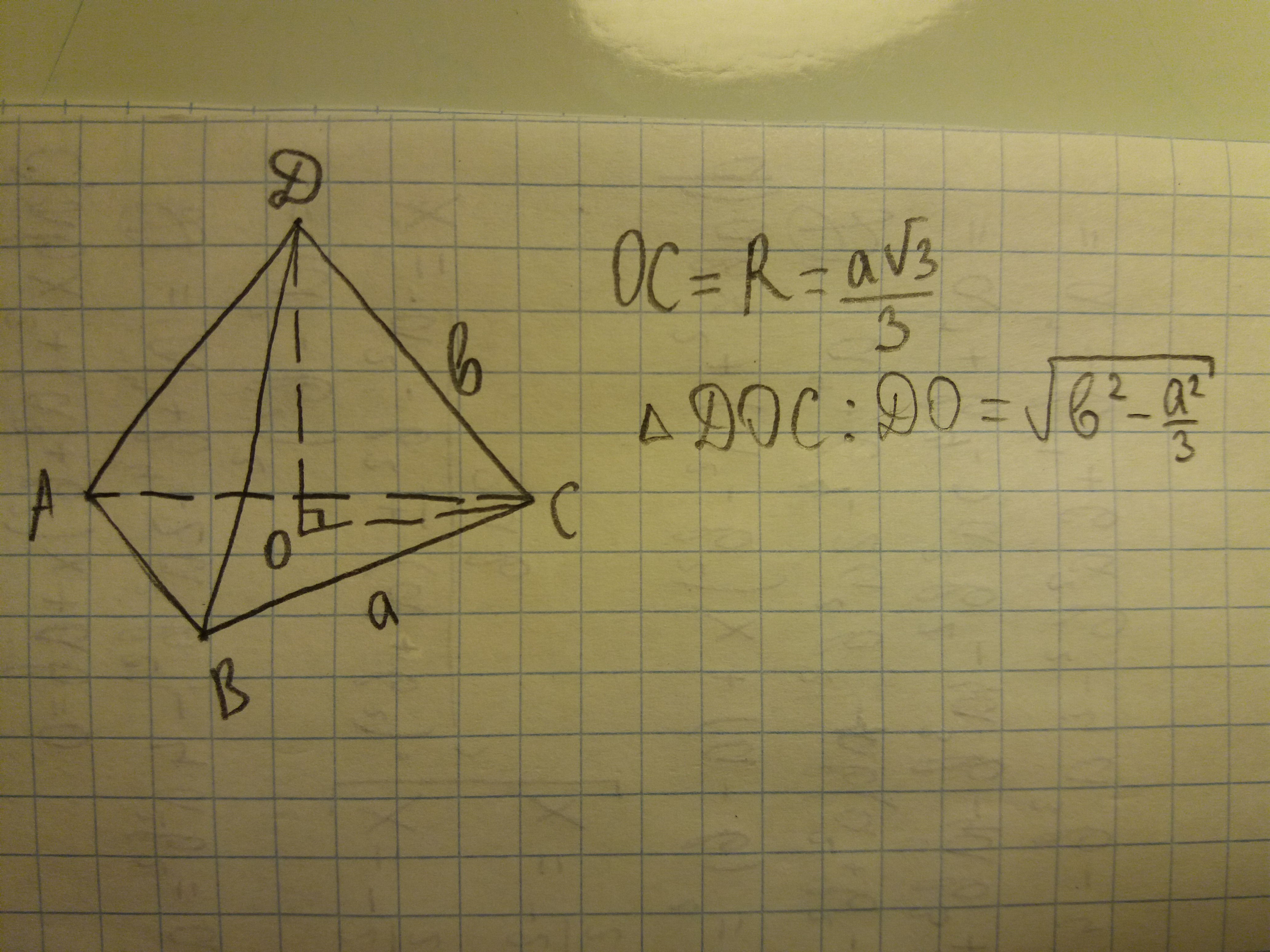Правильная треугольная пирамида. Т. к. ребра равны, то высота пирамиды проецируется в центр описанной окружности. R в равностороннем тр-ке находится по формуле.