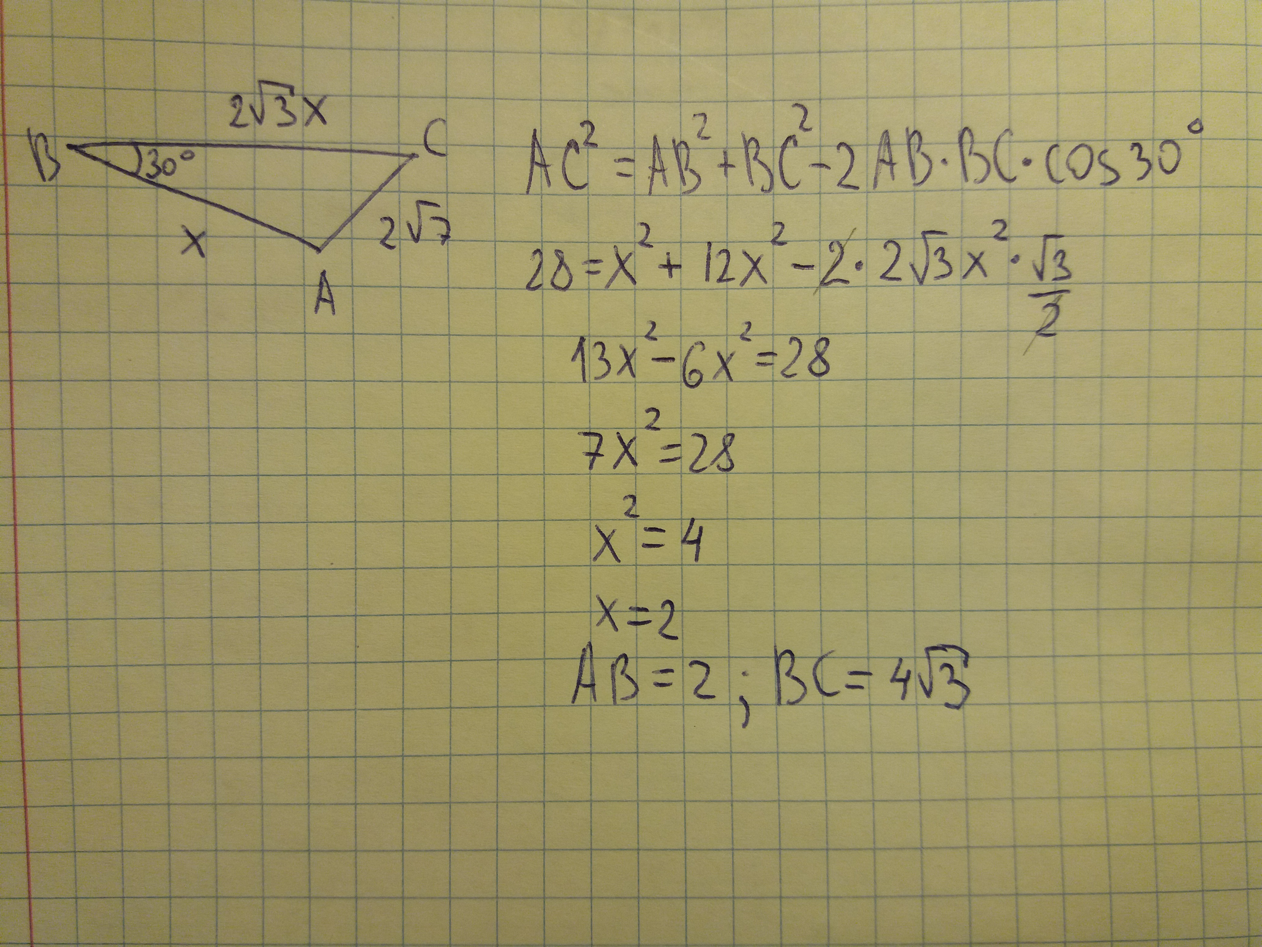 Для решения задачи обозначаем стороны AB и ВС через х и расписываем по теореме косинусов.