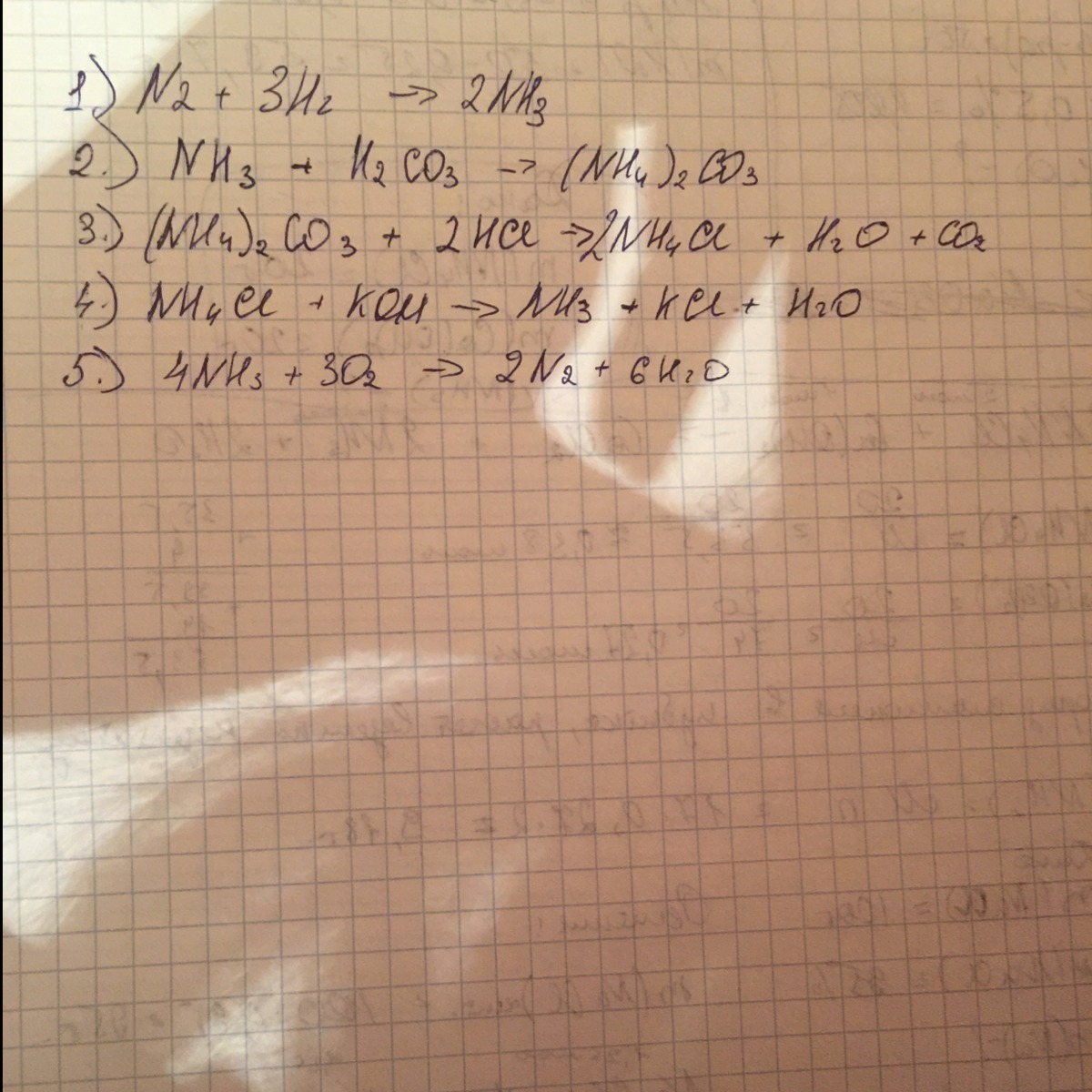 напишите ур-е реакций с помощью которых можно осуществить цепочку превращений веществ;азот>аммиак>карбонат аммония>хлорид аммония>аммиак>азот