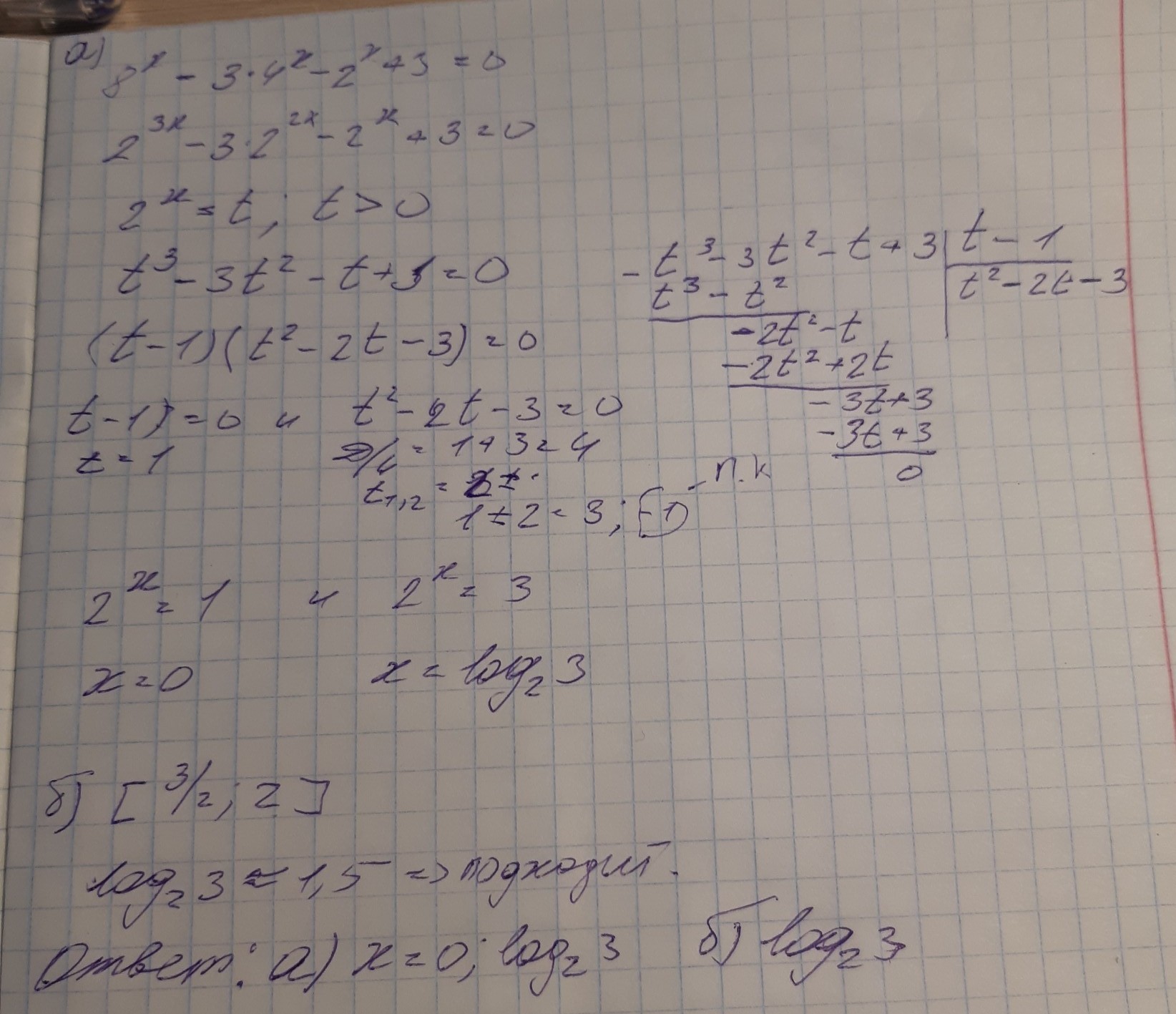 А) решите уравнение 8^x-3*4^x-2^x+3=0 Б) укажите корни этого уравнения, лежащие на отрезке [3/2;2]