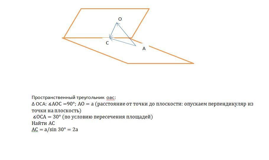 Дві площини перетинаються під кутом 30°. Точка А. яка лежить в одній площині, знаходиться від другої площині на відстані а. Знайдіть відстань від точки А до прямої перегину цих площин.