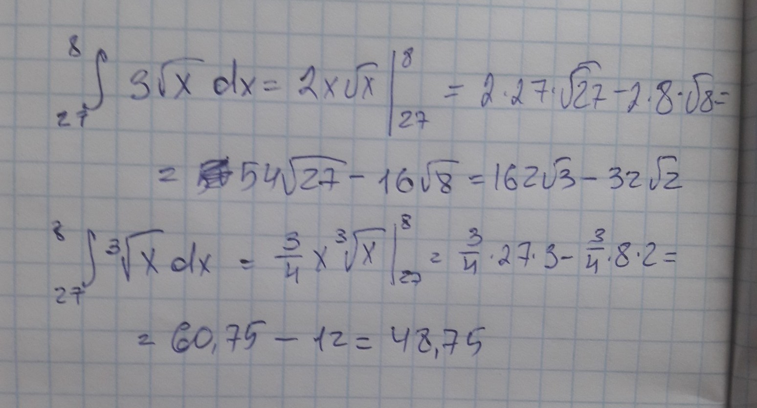 Не совсем то. Там идёт знак интеграл(8 снизу, 27сверху), потом дробная черта( в числители dx, а в знаменатели кубический корень из икс в квадрате)