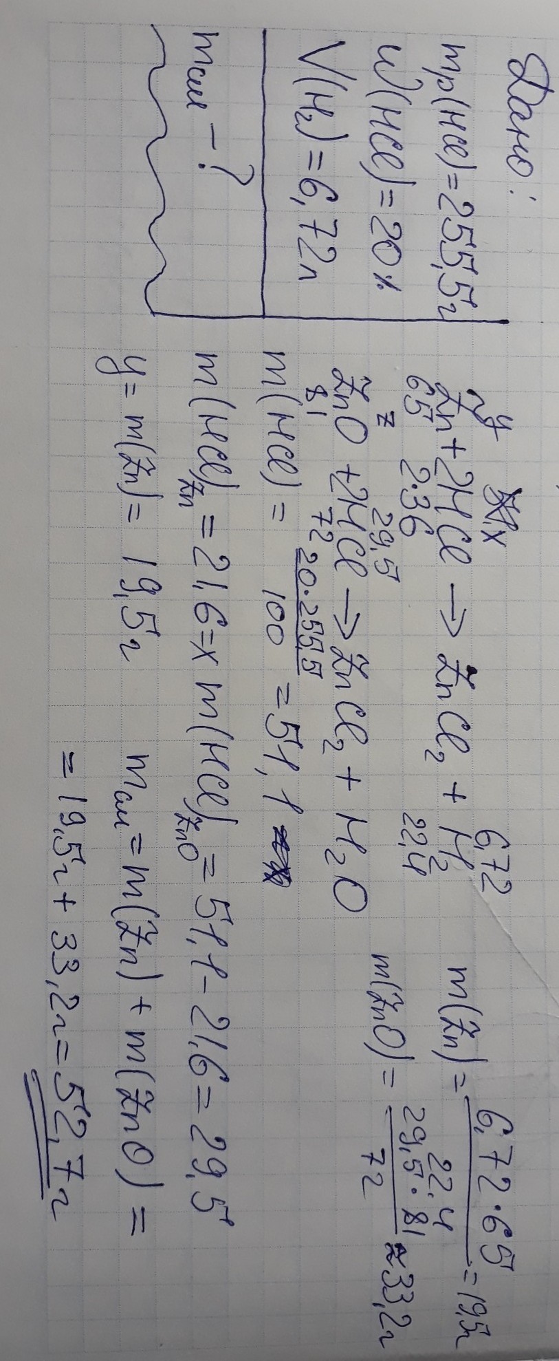 ХИМИЯ 9 КЛАСС -Смесь цинка и оксида цинка полностью растворяется в 255,5 г 20% раствора соляной кислоты. При этом выделяется 6,72 л (н. у.) газа. Найдите массу (в граммах) исходной смеси. Ответ приведите в виде числа с точностью до десятых.