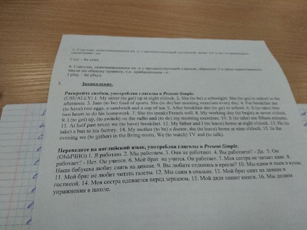 2.1 I work 2 we work 3they dont work 4do you work?-yes,i do 5does he work-no,he doesnt 6my brother doesnt study.he works 7 my sisters doesnt read books 8our grandmother likes to sleep on sofa 9do you like to have rest on armchair? 10we eat and drink in the kitchen 11my brother doesnt like to read newspaper 12 we sleep in the sleeping room 13 my brother sleeps on sofa in living room 14 my sister wears in front of mirror 15my uncle writes a book 16we do exercises at school