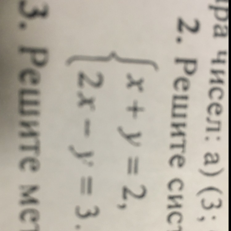 y=2-x. подставляем во 2 уравнение: 2x-(2-x)=3; 2x+x-2=3; 2x+x=3+2; 3x=5; x=5/3. y=2-5/3=6/3-5/3=1/3. Ответ: ( 5/3 ; 1/3).