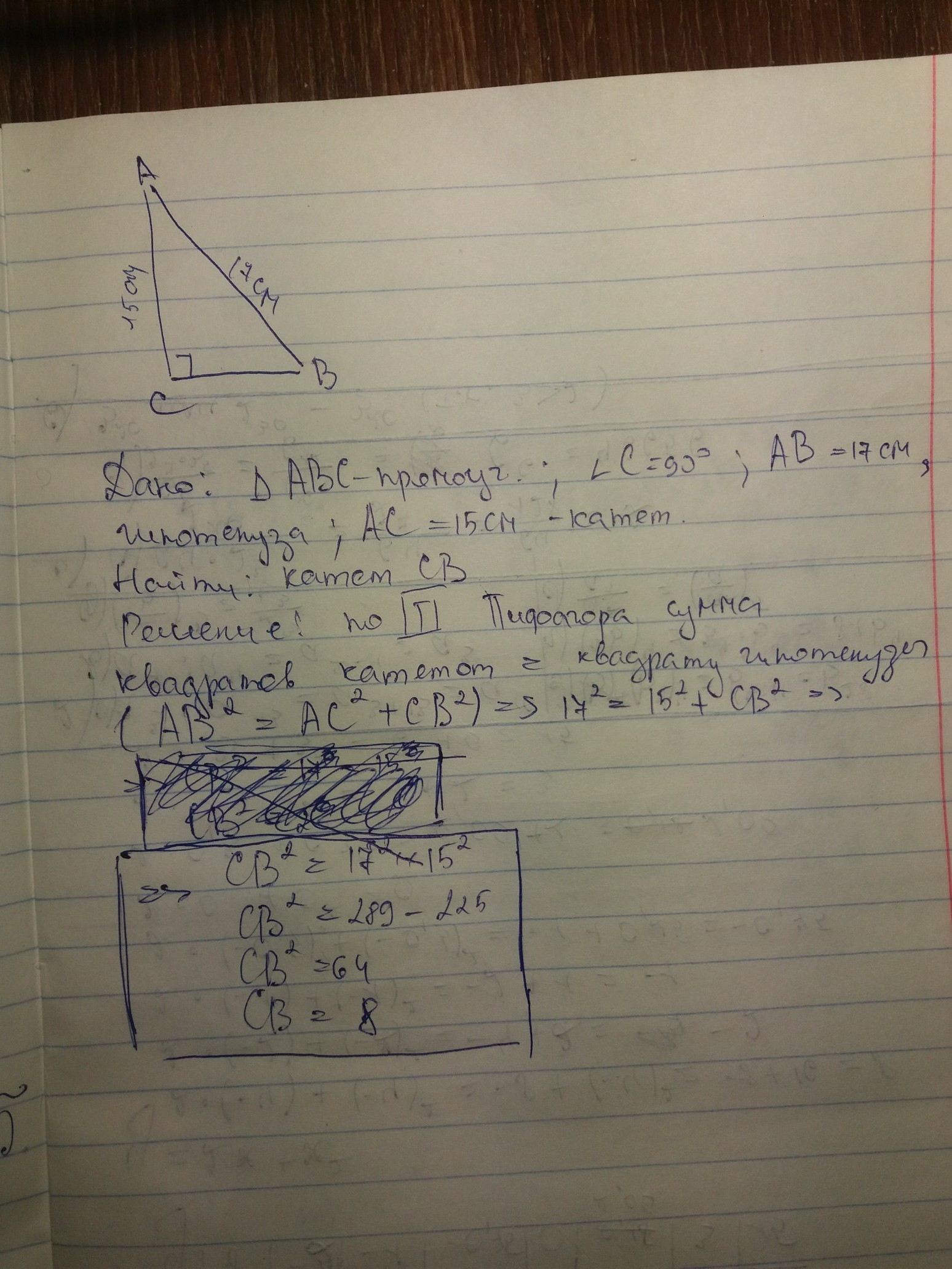 а² = 17² - 15² = 289 - 225.