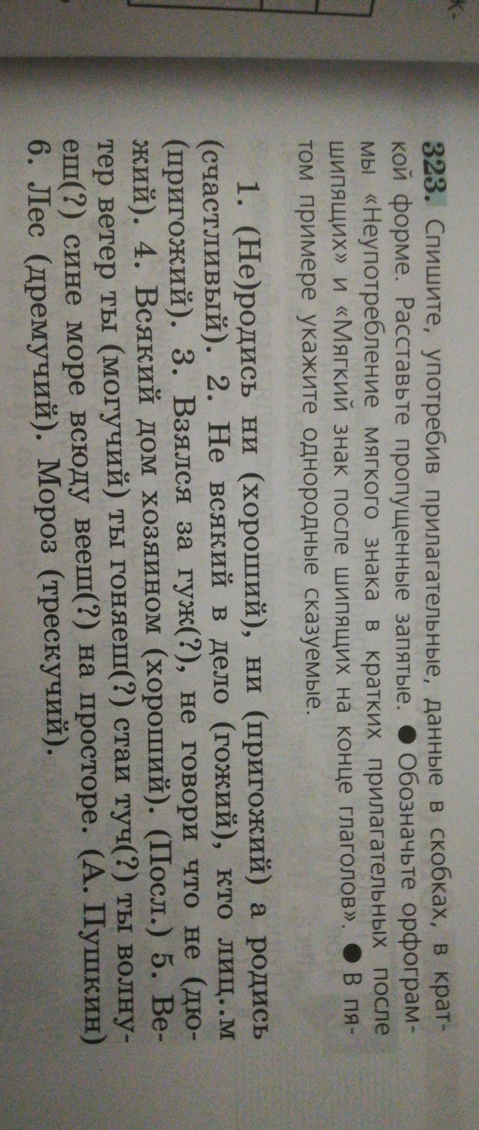 1.Не - родись ни хорош ( кратк . прил . ) , ни пригож ( кратк . прил . ) , а родись счастлив . 2. Не всякий в дело гож ( кратк , прил . ) , кто лицом пригож ( крат . прил . ) . З. Взялся за гуж ( сущ . , 2 - е скл . ) , не говори , что не дюж ( кратк . прил . ) . 4. Всякий дом хозяином хорош ( кратк ил . ) . 5. Ветер , ветер , ты могуч ( крат . прил . ) , ты Мешь стаи туч ( суш . , 3 - е л . , мн . ч . ) , ты волнуешь сине море , всюду реешь на , просторе . 6. Лес дремуч ( кратк прил . ) . Мороз трескуч (кратк , прил . )