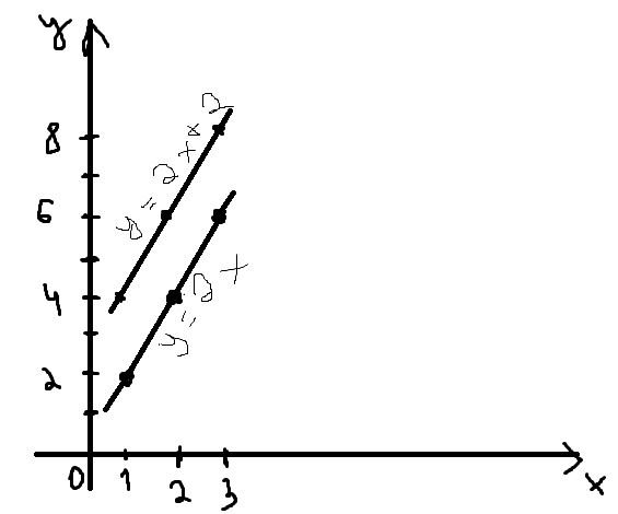 y :) Смотри. у тебя есть функция: y = 2*x. Мы берем x равное 1, подставляем в функцию и получаем: y = 2*1 = 2. Т.е. есть первая точка x=1, y=2. Дальше берем x = 2. Подставляем в функцию: y = 2*2 = 4. Вторая точка: x = 2, y = 4. А дальше уже по примеру для 3 точки