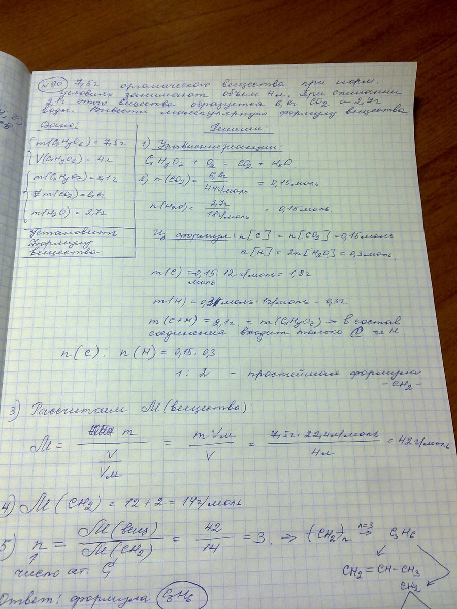 7,5 грамм органического вещества при нормальных условиях занимают объем 4 л.При сжигании 2,1 г этого соединения образуется 6,6 г углекислого газа и 2,7 г воды.Выведите молекулярную формулу соединения