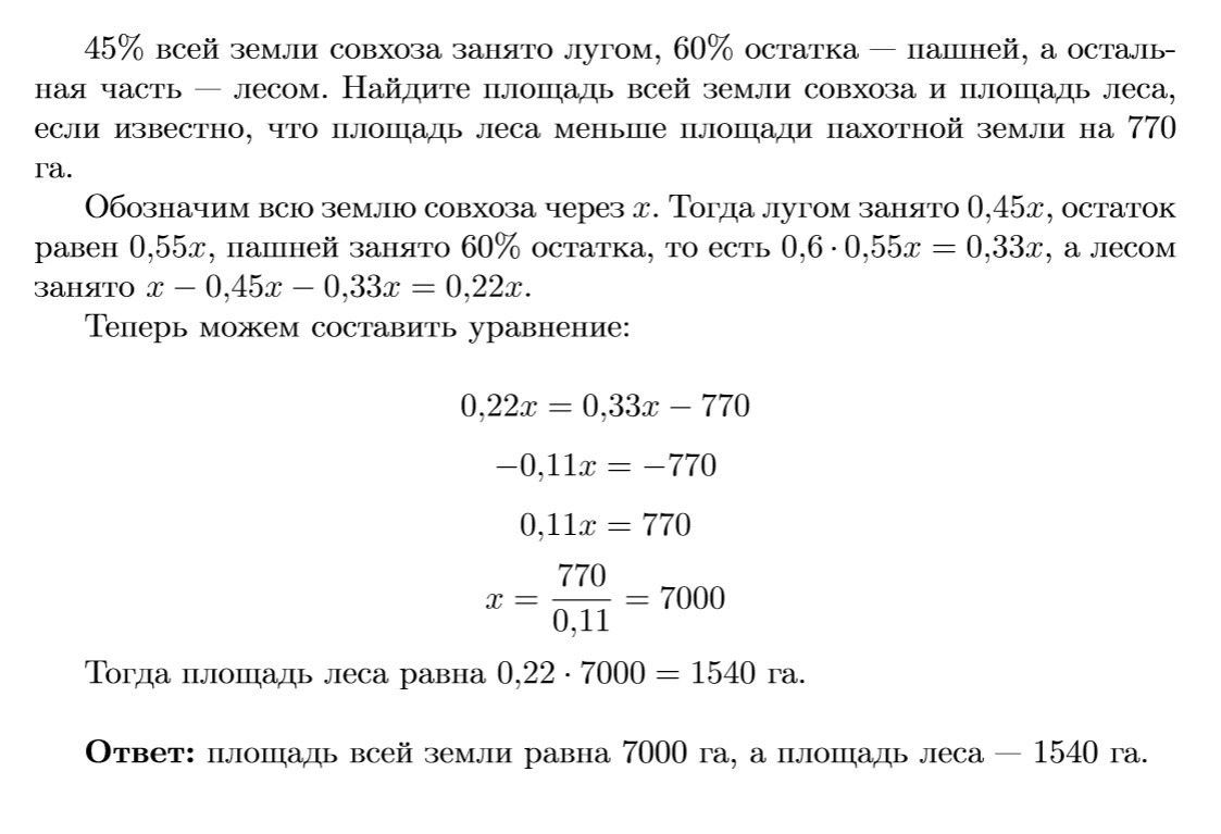45% всей земли совхоза занято лугом, 60% остатка - пашней, а остальная часть - лесом. Найдите площадь всей земли совхоза и площадь леса, если известно, что площадь леса меньше площади пахотной земли на 770га.