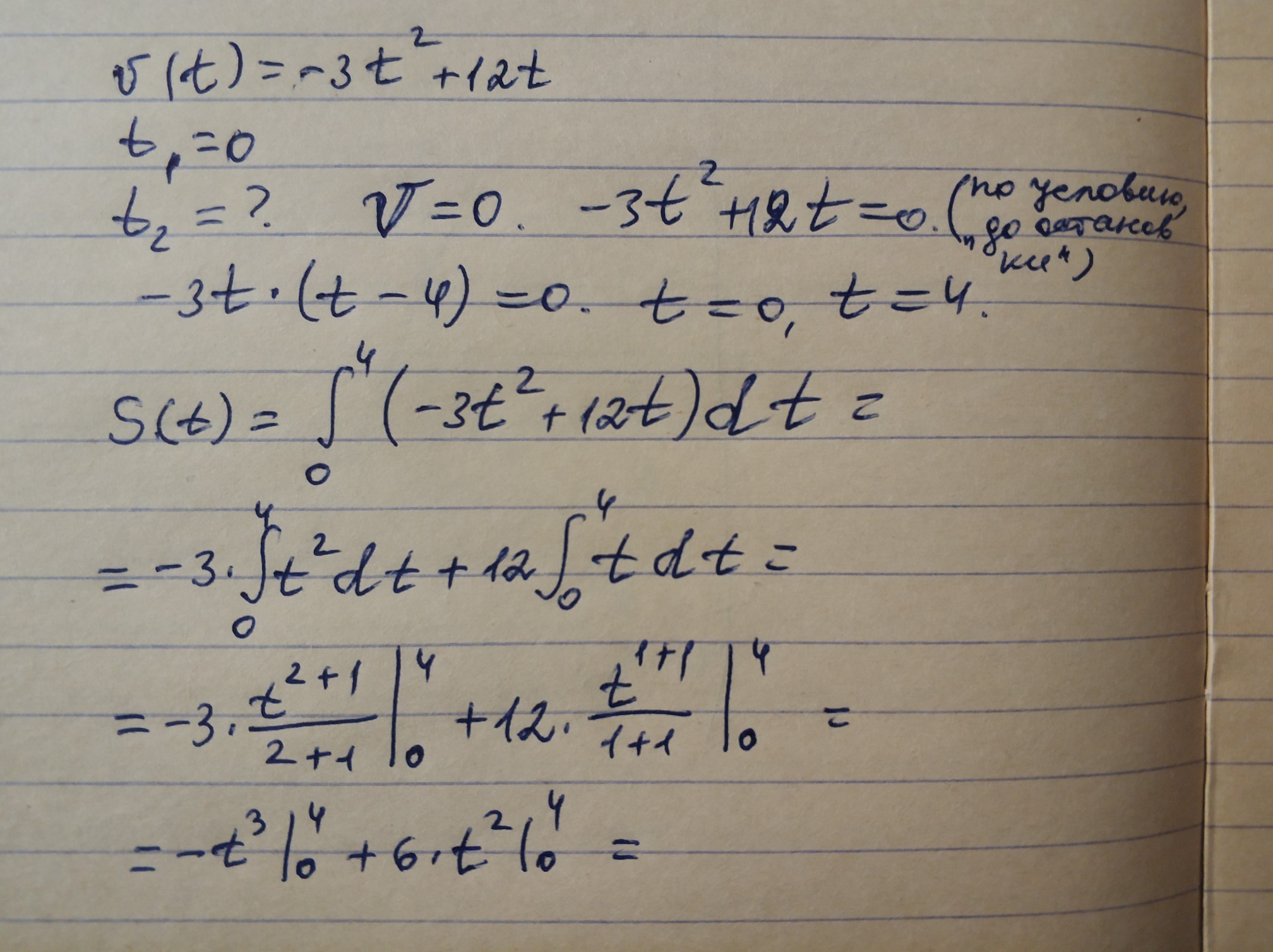 Cкорость движения точки изменяется по закону V=(-3t^2+12t) Найти путь, пройденный точкой от начала движения до ее остановки