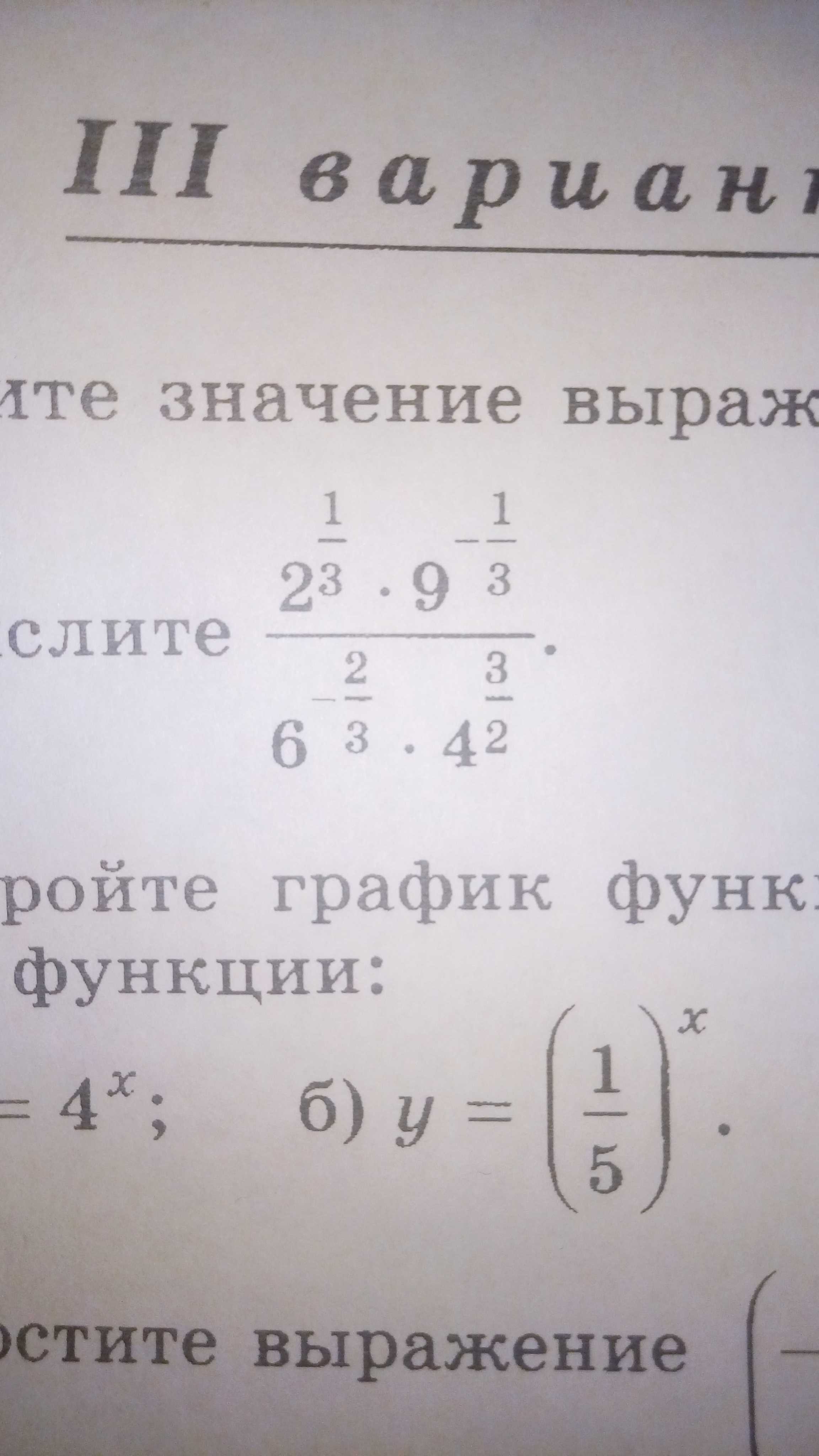 2^1/3*3^-2/3: 2^-2/3*3^-2/3*2^6/2=2^1/3:2^7/3=2^(1/3-7/3)=2^-2=1/4
