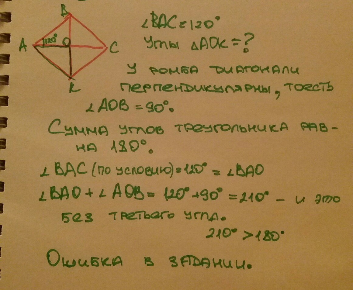 Диагонали ромба АВСК пересекаются в точке О. Найдите углы треугольника АОК если угол ВАС = 120 градусам.
