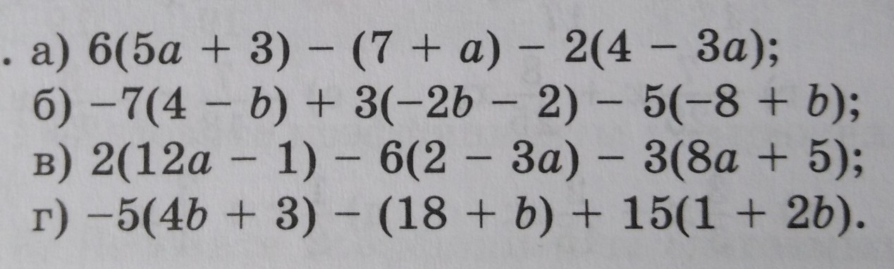 Ответ:а)=30а+18-7-а-(8-6а)=30а+18-7-а-8+6а=35а+3