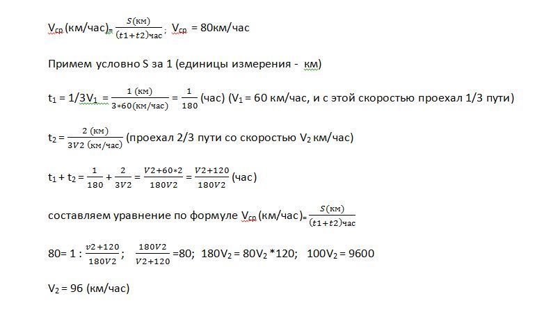 СРОЧНОООО!!!! Треть пути автомобиль проехал со скоростью 60 км / ч. Вычисли скорость движения автомобиля на втором участке пути, если его средняя скорость 80 км / ч